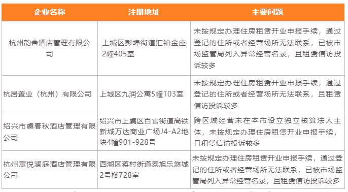 8月,联合检查小组通过线下抽查的形式开展住房租赁市场常态化检查,实地检查了33家住房租赁从业企业,对存在消防安全管理不到位、未及时挂牌租赁房源等违规问题的企业进行督促整改,并将杭州韵舍酒店管理有限公司、杭居置业(杭州)有限公司、绍兴市虞春秋酒店管理有限公司、杭州宸悦澜庭酒店管理有限公司4家企业列入风险名单。