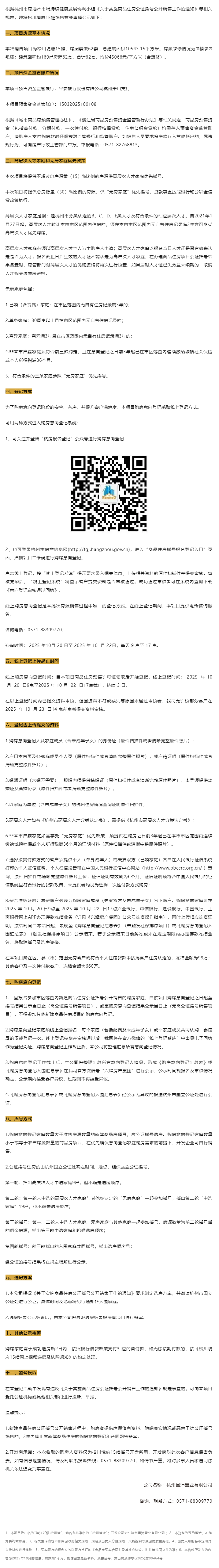 10月19日,松川境府销售方案公示,本次销售项目为松川境府15幢,房屋套数62套。