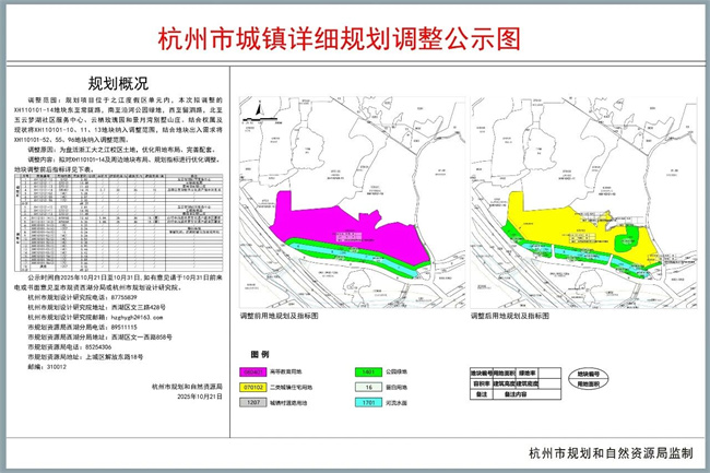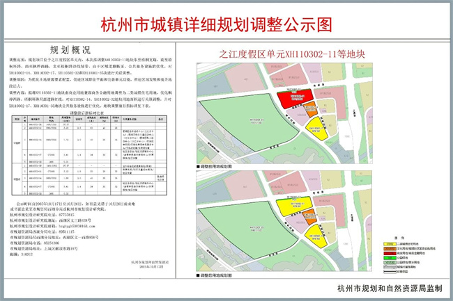 10月20日,杭州市自然资源和规划局对之江度假区单元XH110101-14及周边地块选址暨详规局部调整进行了公示。公示时间自2025年10月21日至10月31日。