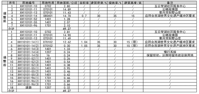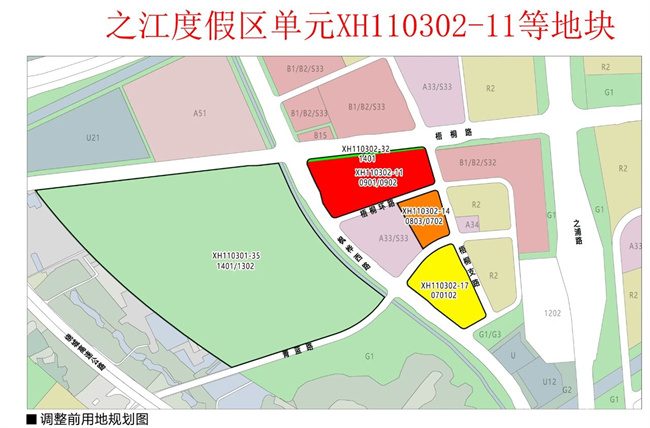 调整范围:规划项目位于之江度假区单元内,本次拟调整XH110302-11地块东至梧桐支路,南至梧桐环路,西至枫桦西路,北至梧桐路沿线绿带。由于区域道路断面、公共服务设施的优化,对XH110302-14、XH110302-17、XH110302-32和XH110301-35块进行关联调整。