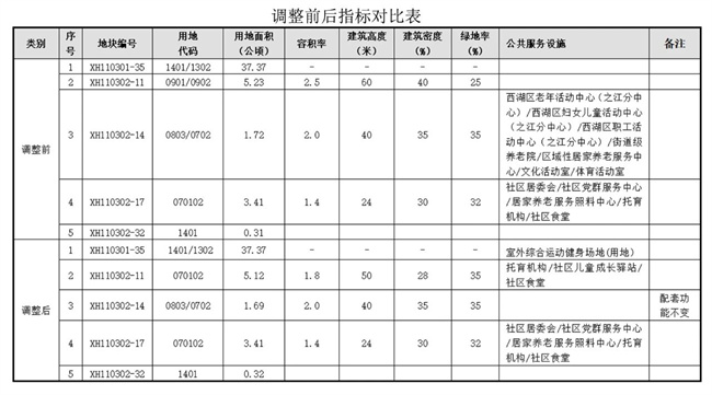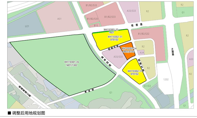调整内容:拟将XH110302-11地块由商业用地兼容商务金融用地调整为二类城镇住宅用地,优化枫桦西路、梧桐环路局部道路红线,对XH110302-14、XH110302-32地块用地面积进行关联调整,并对XH110302-17、XH110301-35地块公共服务设施进行优化。