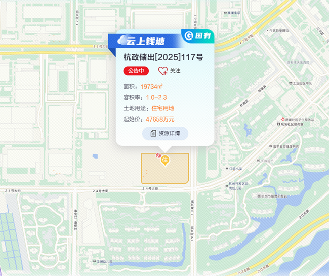 杭政储出[2025]117号(白杨单元QT030501-47-2地块)东至19号大街,南至24号大街,西至规划19A号大街,北至白杨单元QT030501-47-1地块。出让面积19734㎡(29.601亩),1.0<容积率≤2.3,竞地价起始价47658万元,楼面起价约10500元/㎡。