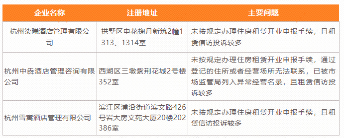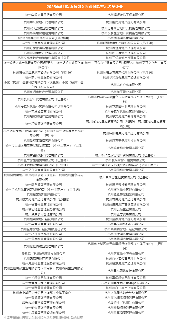近日,杭州发布2025年第十批住房租赁企业风险名单,新增杭州柒曦酒店管理有限公司、杭州中犇酒店管理咨询有限公司、杭州雪寓酒店管理有限公司3家。