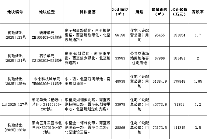 这5宗地块分布于西湖区转塘单元、拱墅区石桥单元、余杭区未来科技城、萧山市北和湘湖。总出让土地面积约20.2万㎡,总出让建筑面积约32.8万㎡,总起价约64.9亿元。