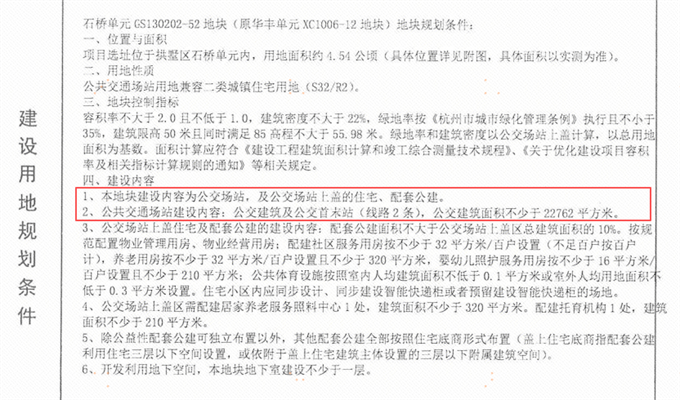 地块建设内容为公交场站,及公交场站上盖的住宅、配套公建。其中配建的公建场站(含盖板),公交建筑及公交首末站(线路2条),建筑面积不少于22762平方米,用地面积11381平方米,以划拨方式供地,由受让人代建,建成后由杭州市城市建设投资集团有限公司负责回购。