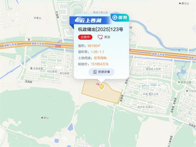 杭政储出[2025]123号即转塘单元XH100403-09地块,具体位置东至知音路绿化,南至规划道路,西至规划绿化,北至规划道路。出让面积56150㎡,出让建筑面积95455㎡,容积率1.05≤容积率≤1.7,出让起价151854万元,楼面起价约15908元/㎡。