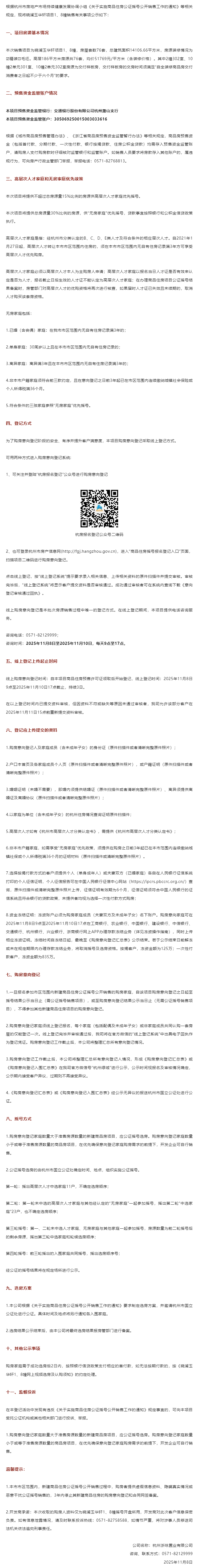 11月8日,晓澜玉华轩销售方案公示,本次销售项目为晓澜玉华轩项目1、8幢,房屋套数76套。