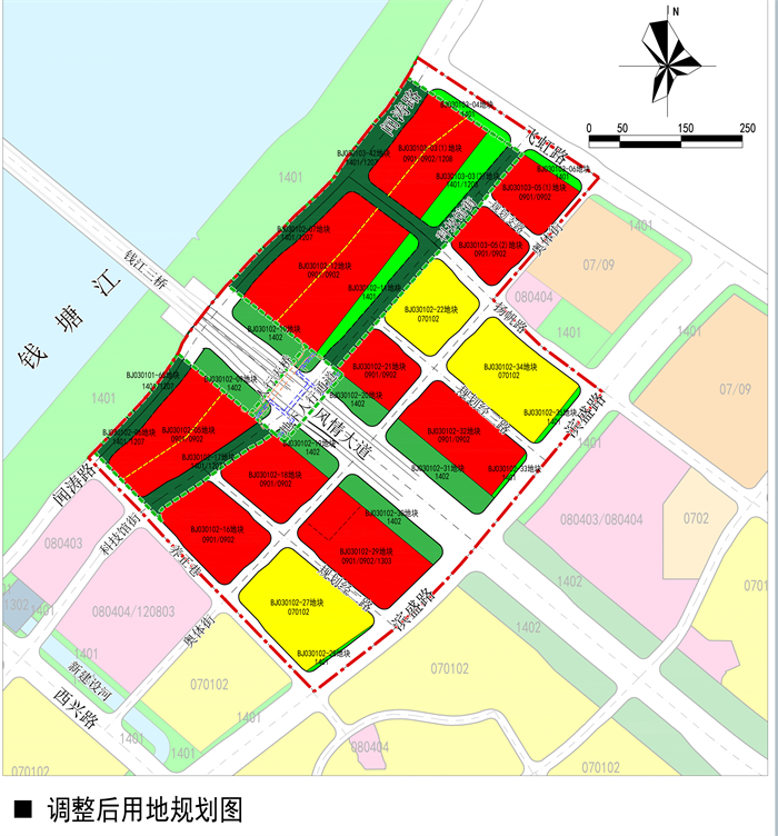 11月10日,杭州市规划与自然资源局发布一则规划公示,因提升城市滨水景观风貌,重塑城市天际线,优化用地布局及交通组织,提高土地利用效率。调整西兴单元BJ030102-05、12等地块规划。公示时间自2025年11月11日至11月20日。具体调整内容如下: