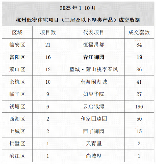 杭州楼市整体承压背景下,低密市场走出独立行情。2025年1-10月,杭州新房住宅成交3.6万套,同比下降20.7%,反观低密住宅(三层及以下墅类产品)成交1170套,同比增长29.7%。