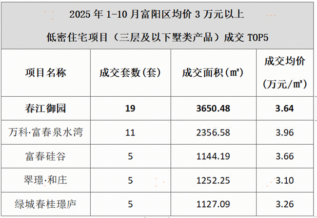 2025年1-10月,春江御园,位列富阳区3万元以上低密住宅项目成交第一名,是富阳区低密住宅产品的标杆项目。