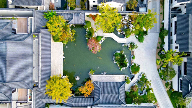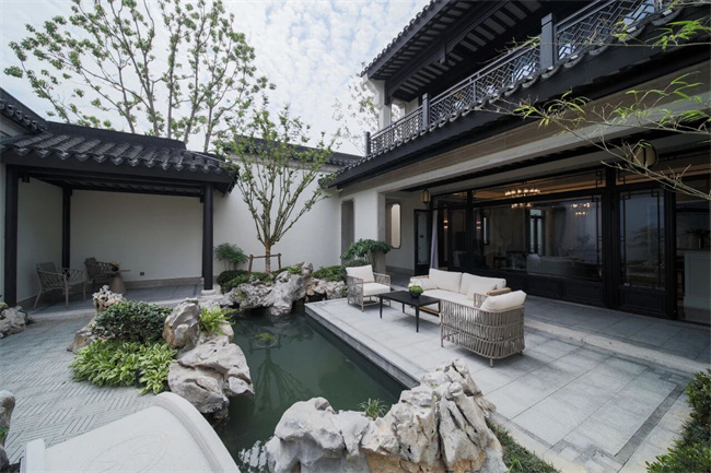春江御园以《富春山居图》为灵感,由GOA大象设计、绿城风景园林设计、香山帮非遗团队联袂打造,复刻白墙黛瓦、飞檐戗角,搭配5.9米挑高地下室及南北双庭院,实现买两层得四层的空间革新。