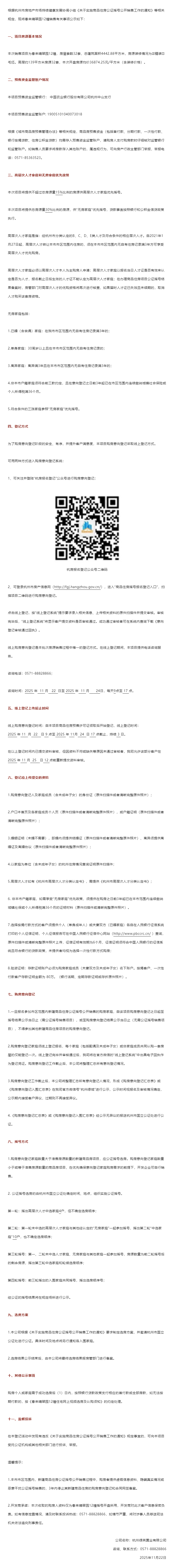 11月22日,春来晴翠园销售方案公示,本次销售项目为春来晴翠园12幢,房屋套数32套。