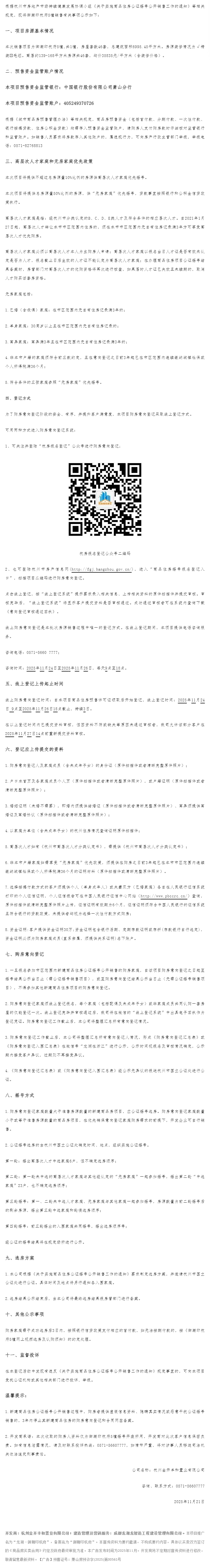 11月24日,御潮印杭府销售方案公示,本次销售项目为御潮印杭府5幢,共1幢,房屋套数46套。