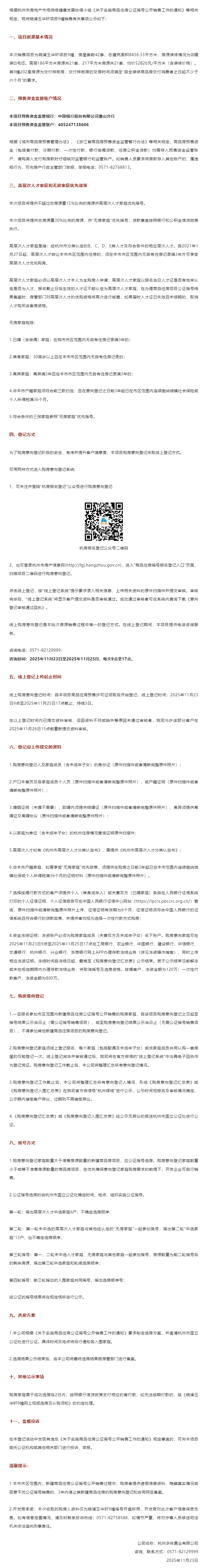 11月23日,晓澜玉华轩销售方案公示 ,本次销售项目为晓澜玉华轩项目9幢,房屋套数42套。