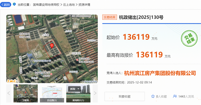 最终,经过一轮挂牌报价,该地块由杭州滨江房产集团股份有限公司(滨江集团)以底价136119万元竞得,成交楼面价20935元/㎡,溢价率0%。