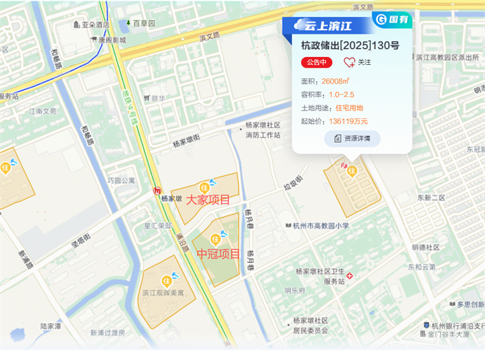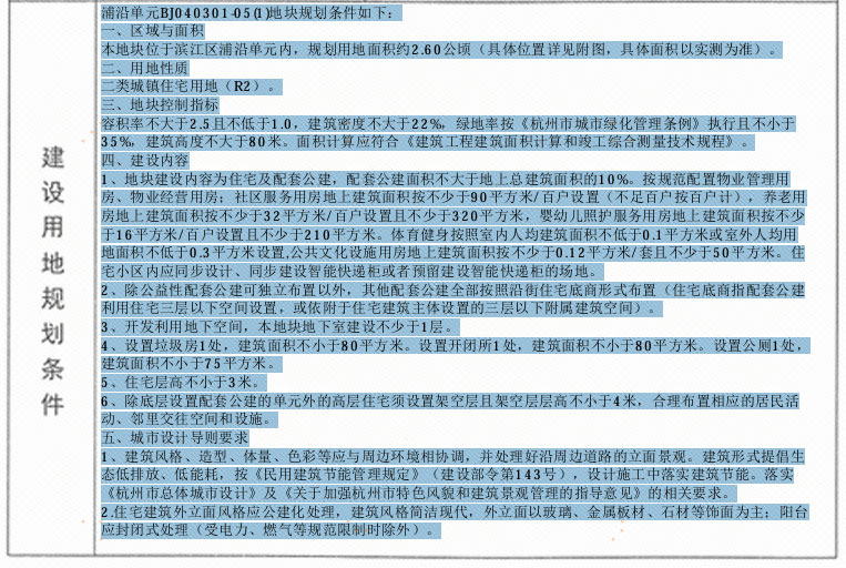 该地块为杭州市住宅品质提升试点项目,出让面积26008㎡(约合39.0亩),规划建筑面积约6.5万㎡,起始总价约13.6亿元,起始楼面价为20935元/㎡。