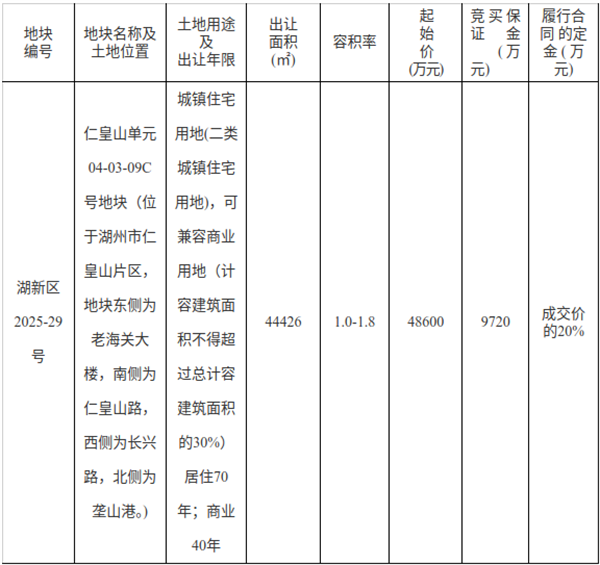 12月4日,湖新区2025-29号仁皇山单元04-03-09C号地块正式挂牌,出让面积44426m²(其中普通商品住房用地31099m²,零售商业用地13327m²),起拍楼面价约6078元/m²,起拍价为4.86亿元。