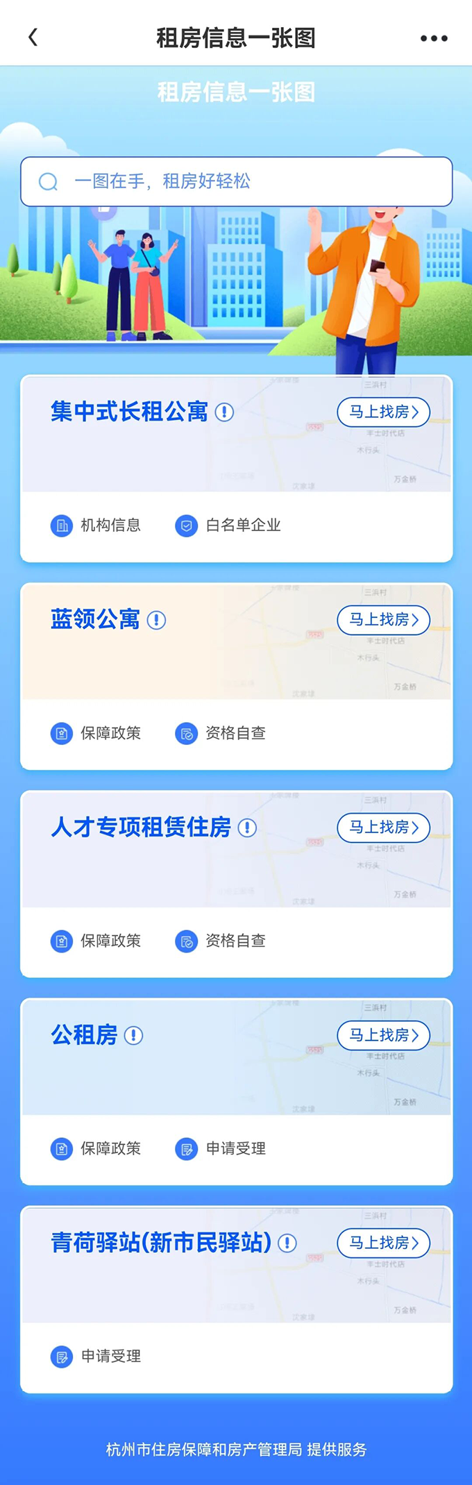 为让新市民、青年人方便租房,我市推出“租房信息一张图”应用,以地图和列表形式,集中展示蓝领公寓、人才专项租赁住房、长租公寓等各类房源信息,集成租赁政策查询、租赁机构信息查看等功能,并提供蓝领公寓、人才专项租赁住房、长租公寓等房源线上预约看房服务。该应用已在“浙里办”和“杭州市民卡”APP同步上线,为新市民和青年人提供“一站式”的找房租房服务。目前,已上线各类保障性租赁住房项目167个,展示房源信息8.4万套(间)。
