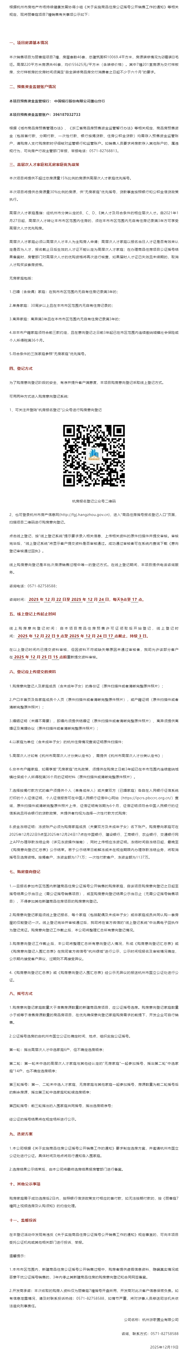 12月20日,丽香庭销售方案公示,本次销售项目为丽香庭项目7幢,房屋套数46套。