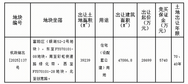 杭政储出[2025]137号(银湖52-2号地块),东至FY070101-08地块,南至彩虹快速路绿化带,西至FY070101-28地块,北至创意路。出让面积39239㎡,容积率1.2,可建面积约4.7万㎡,起始楼面价6095元/㎡。