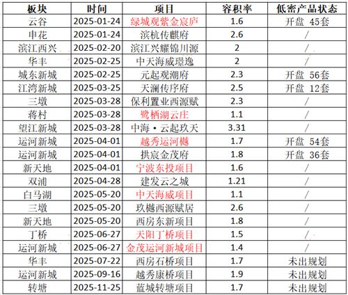 2024年出让的低容积率涉宅用地中,部分7层及以下的低密产品项目在2025年上市,如杭颂府(107套)、天青岳(100套)、湖山丽舍(104套)。