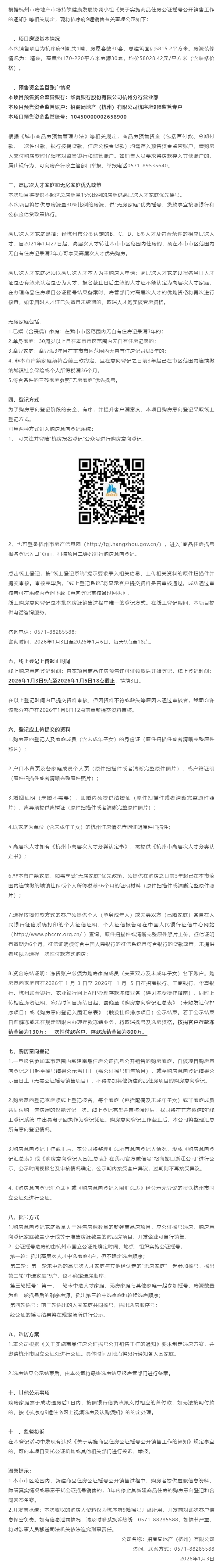 1月3日,杭序府销售方案公示,本次销售项目为杭序府9幢,共1幢,房屋套数30套。