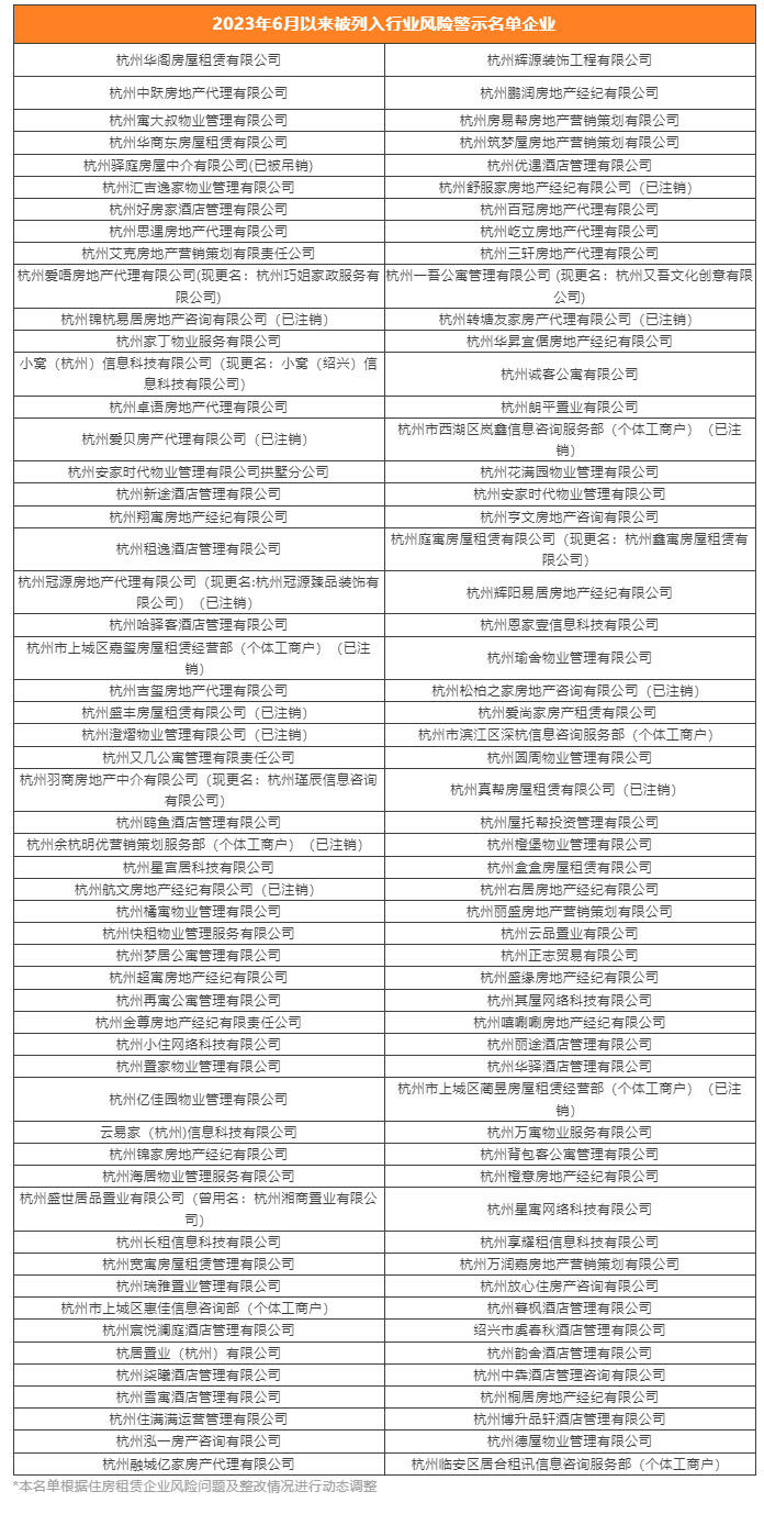 近日,杭州发布今年首批住房租赁企业风险名单,新增杭州融城亿家房产代理有限公司、杭州临安区居合租讯信息咨询服务部(个体工商户)2家住房租赁企业。