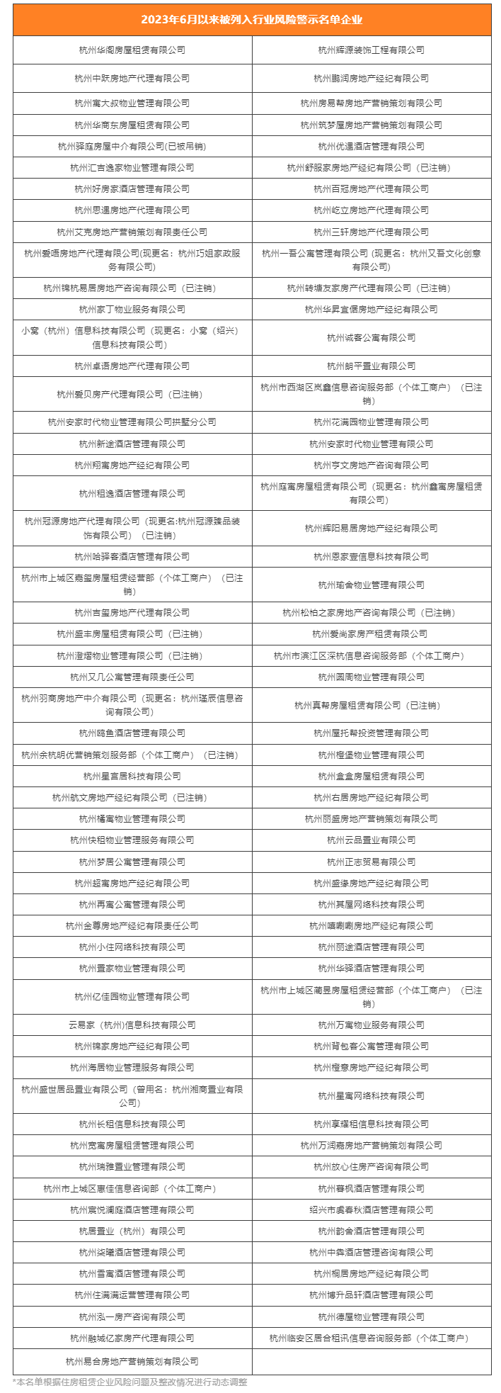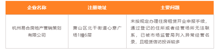 近日,杭州发布今年第二批住房租赁企业风险名单,新增杭州易合房地产营销策划有限公司1家住房租赁企业。